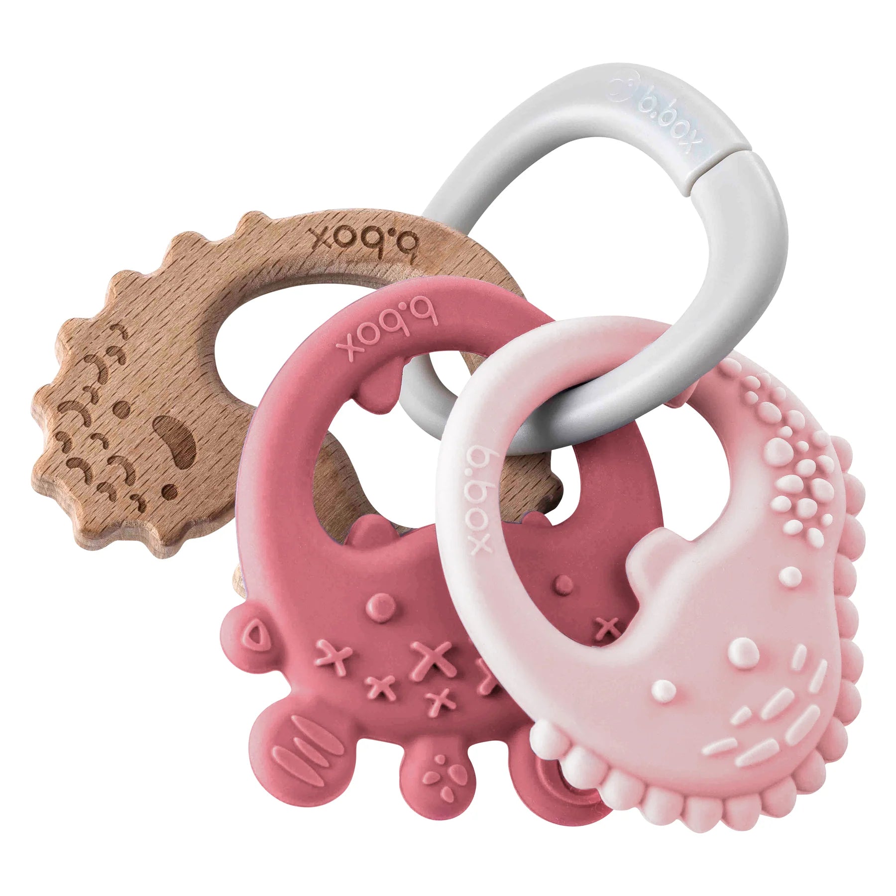 The trio teether is three textured teethers on one handy ring offering the choice of silicone and beechwood throughout the teething journey. Lightweight and easy to hold, use individually or as a set with customisable ring attachment to provide relief to sore, achy gums and stimulate sensory development. Suitable from 3 months and designed to grow with baby. Soft silicone ideal for early stages of teething, medium silicone features coarser textures and longer features to relieve the middle mouth and beechwood offers firm pressure with protruding features to comfortably reach the back of bubs mouth.
